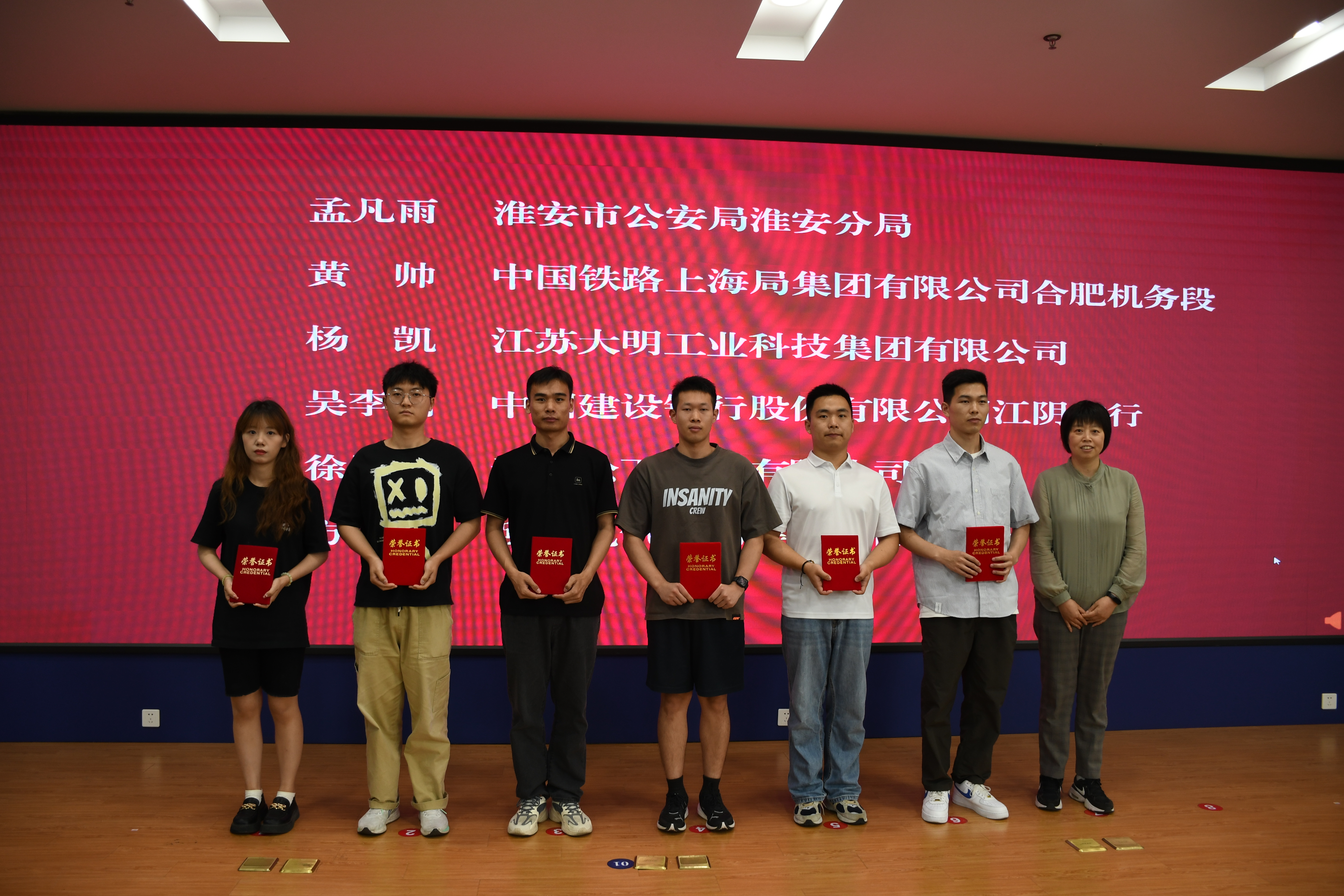 表彰仪式上,裴晓芳、林峰、费鹏程为考研、考公和就业的优秀学生代表颁奖并合影留念。