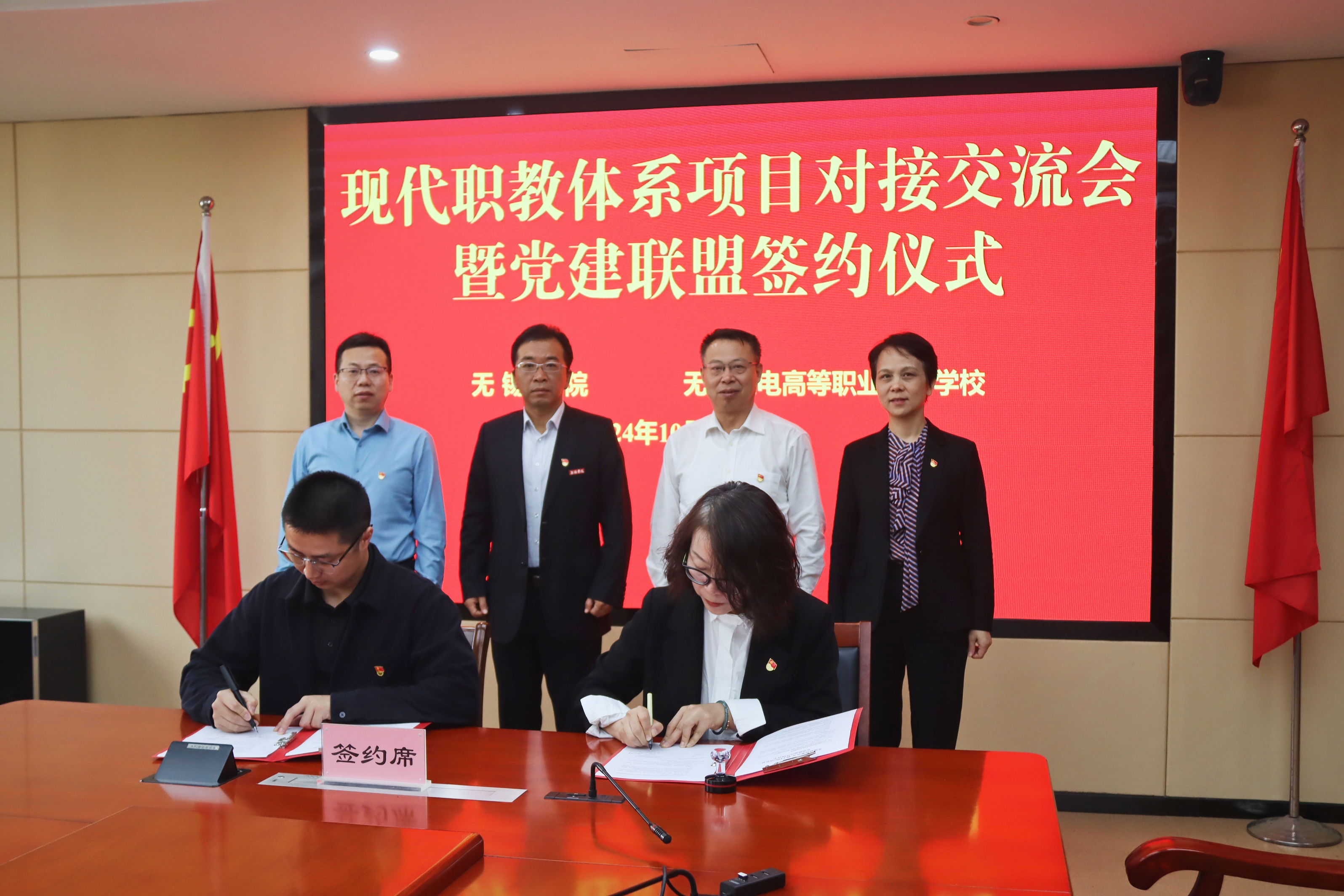 为全面贯彻落实党的二十届三中全会精神,充分发挥党建引领作用,以高质量党建引领教育高质量发展,10月25日上午,我校与无锡机电高等职业技术学校在无锡机电高等职业技术学校智慧会议室共同开展现代职教体系项目对接交流会暨“党建联盟聚合力 携手同行谱新篇”党建联盟签约仪式,我校党委常委、副校长胡剑凌出席活动,应用技术学院院长齐运锋,副院长武丽,党总支副书记张伏青等参与本次签约仪式。无锡机电高等职业技术学校党委书记蔡军,党委委员、副校长吴艳瑾,教务处主任宋浩一行热情相迎。